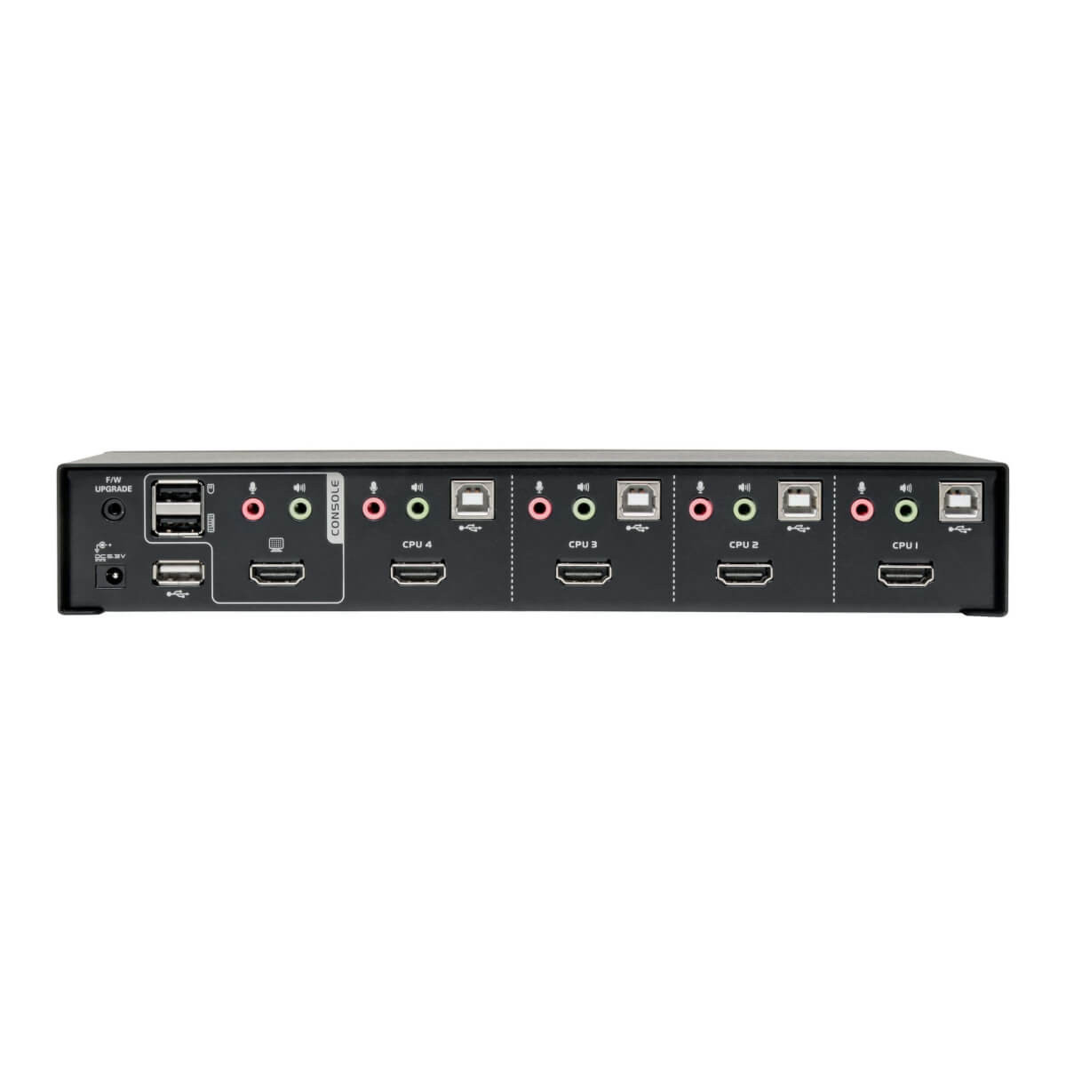 The B004-HUA4-K KVM switch supports high-definition video resolutions up to 1920 x 1200 (including 1080p) at 60 Hz, 2.1-channel surround sound audio, and USB 2.0 data transfer rates up to 480 Mbps. With independent audio switching, you can enjoy music or other audio from one computer while working on another. The front-panel audio jacks take priority over the rear-panel jacks.