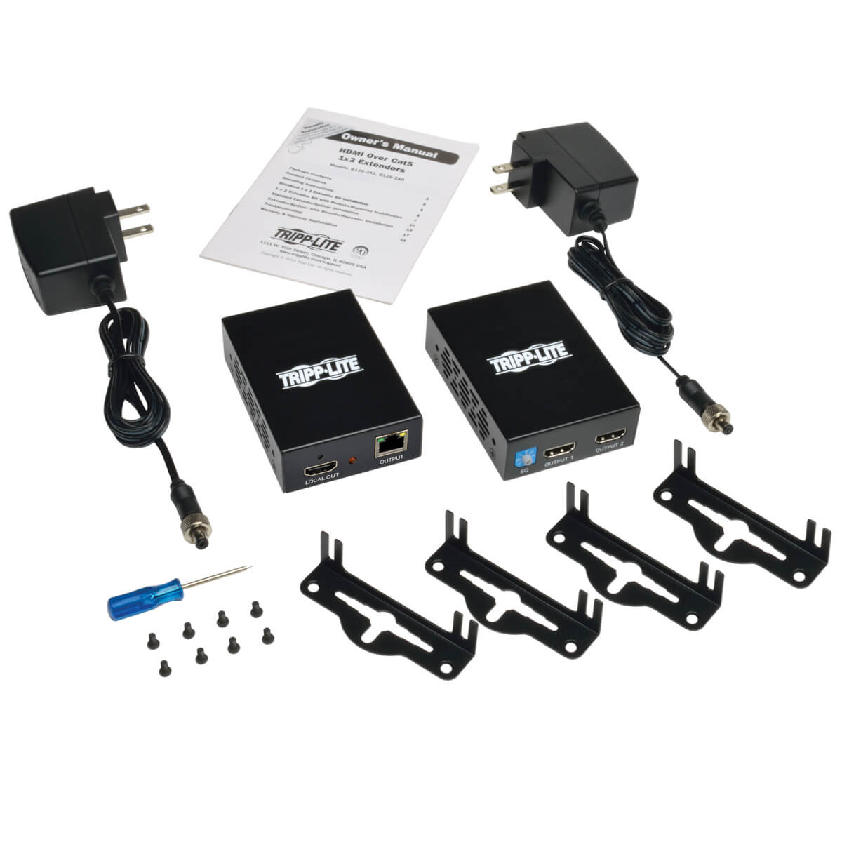 The Tripp Lite B126-2A1 HDMI over Cat5/Cat6 Extender Kit is designed to extend HDMI signals up to 200 feet, making it perfect for various applications such as digital signage, trade shows, classrooms, and retail settings. This kit includes a transmitter and a receiver that work together to connect two displays to a single HDMI source.