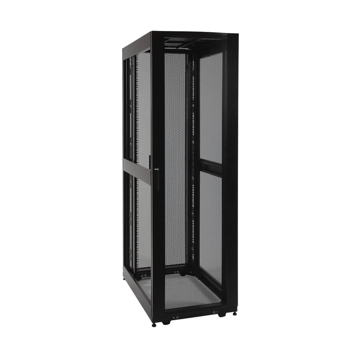 The Tripp Lite SR42UB is a standard-depth 42U server cabinet designed to accommodate 19-inch rack equipment in various environments, including server rooms, IT closets, and micro data centers. Constructed from heavy-duty steel with a durable black powder-coated finish, this cabinet offers a maximum stationary load capacity of 3500 pounds (1588 kilograms) and a maximum rolling load capacity of 2250 pounds (1022 kilograms).