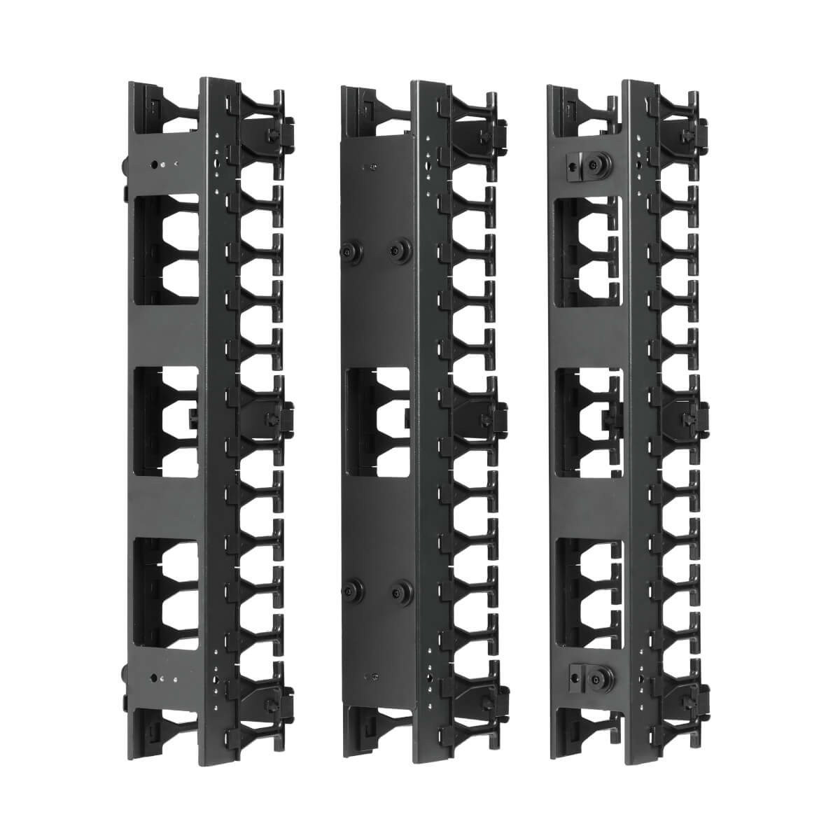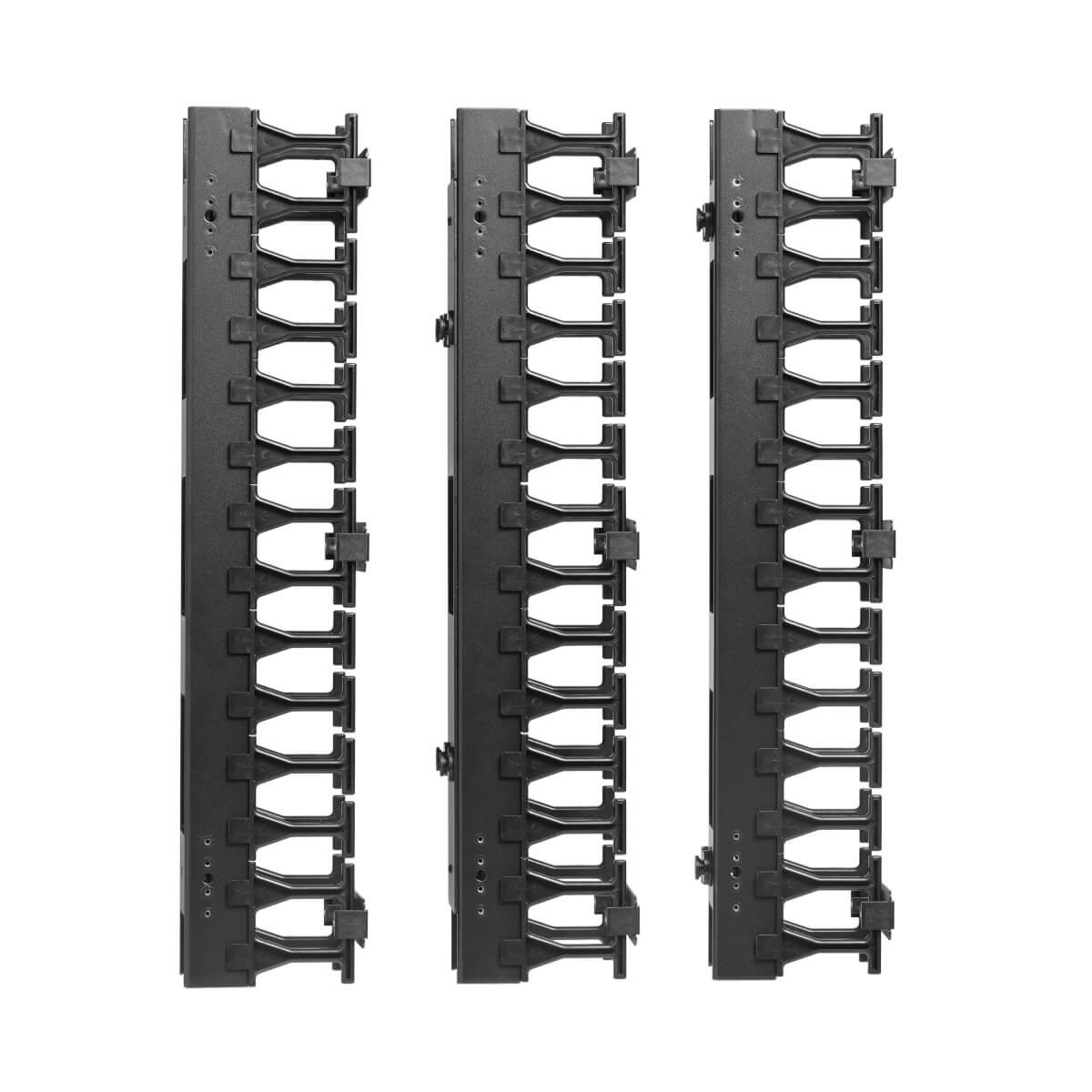 The SmartRack® SRCABLEVRT3 is designed to streamline your cable management, helping to eliminate cable stress and maintain a tidy enclosure. This vertical cable manager features a 6-foot (1.8 meters) height and a 3-inch (7.6 centimeters) width, making it ideal for large cable bundles. It is split into three 2-foot (0.6-meter) sections, allowing for versatile installation options. With toolless button mounting, installation is quick and easy.