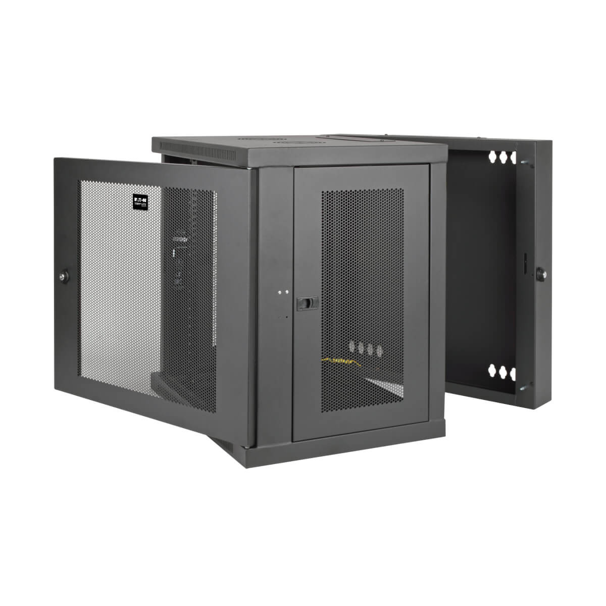 Constructed from heavy-duty steel with a durable black powder-coated finish, this cabinet boasts a maximum load capacity of 200 pounds (90.7 kilograms). The cabinet swings away from the wall on a sturdy hinge, providing easy back-door access to equipment and cabling during installation and maintenance.