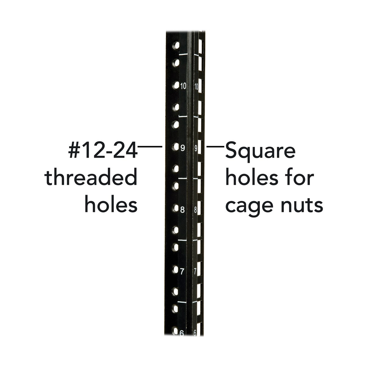 The SRW10USG ships fully assembled for quick installation. It can be mounted to the wall or rolled on the floor with the optional SRCASTER caster kit. Wall-mounting holes are spaced 16 in. apart for standard wall stud placement, and vertical mounting rails adjust in 7/8 in. increments to accommodate equipment up to 20.5 in. deep, such as network switches and patch panels. The rails support square-hole or 12-24 threaded-hole mounting, and rack spaces are numbered for easy reference.