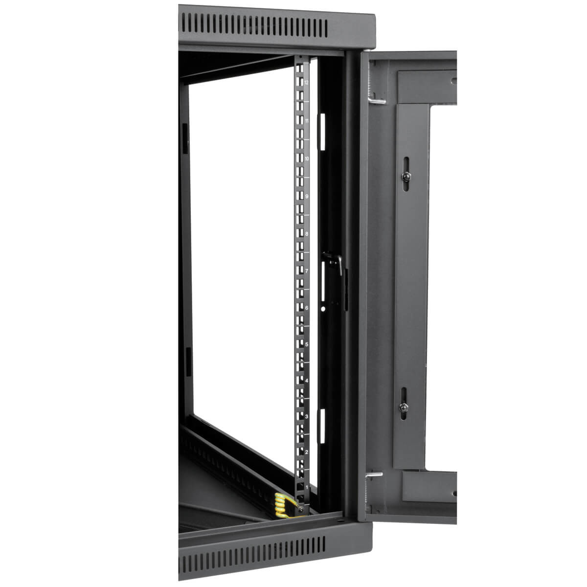 The cabinet swings away from the wall on a sturdy hinge, providing easy back-door access for installation and maintenance. With secure locking doors and side panels, your equipment is protected from tampering and theft. The vented design at the top, bottom, and removable side panels promotes airflow, keeping your equipment cool.