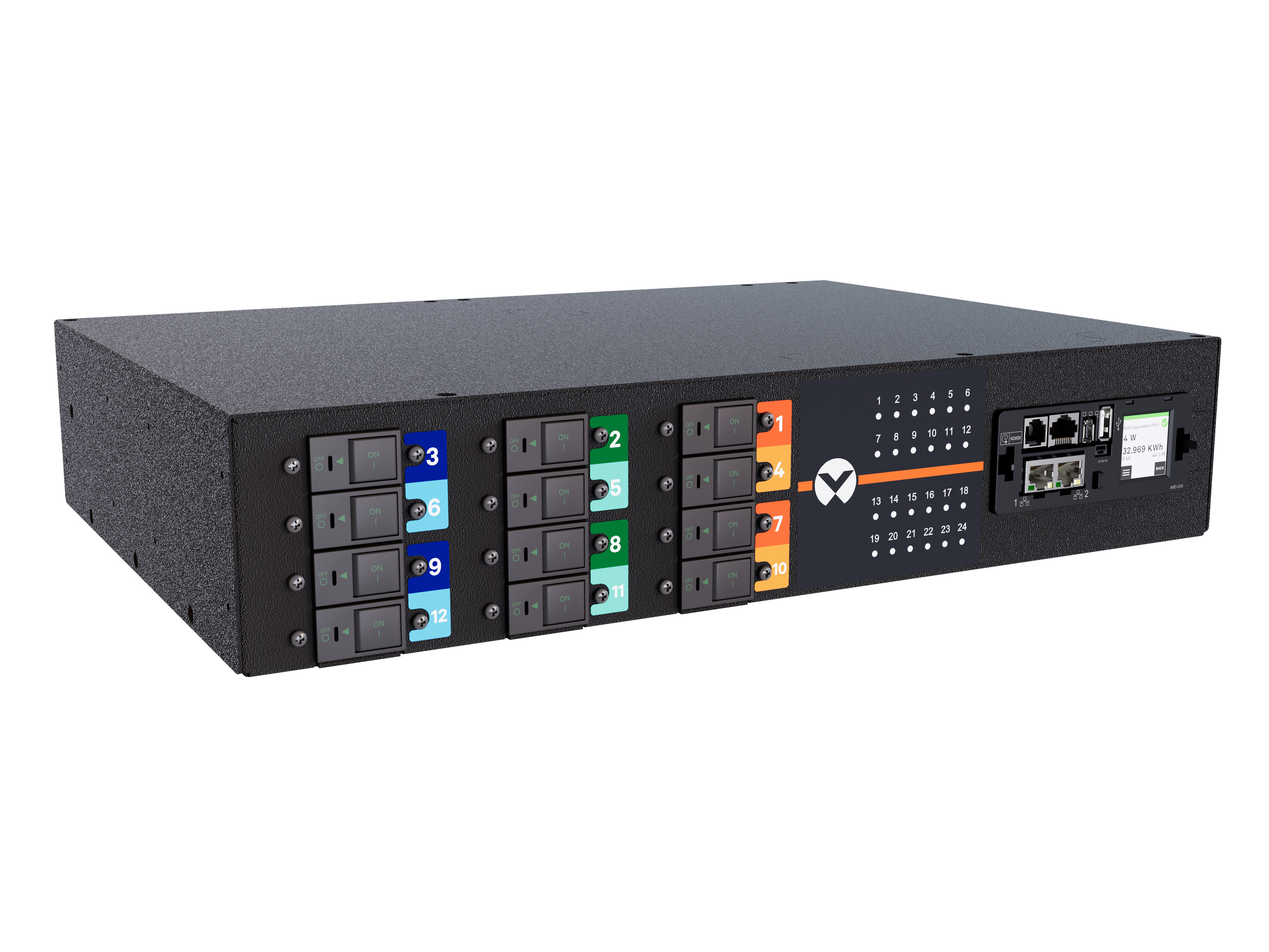 The Vertiv PowerIT Switched Outlet Level Monitored High Density Rack Power Distribution Unit (rPDU) VP7U62A2 is designed for high-performance environments, offering a robust solution for power distribution. This upgradeable, 60/63A, 240/415V WYE, 2U, horizontal rPDU features: